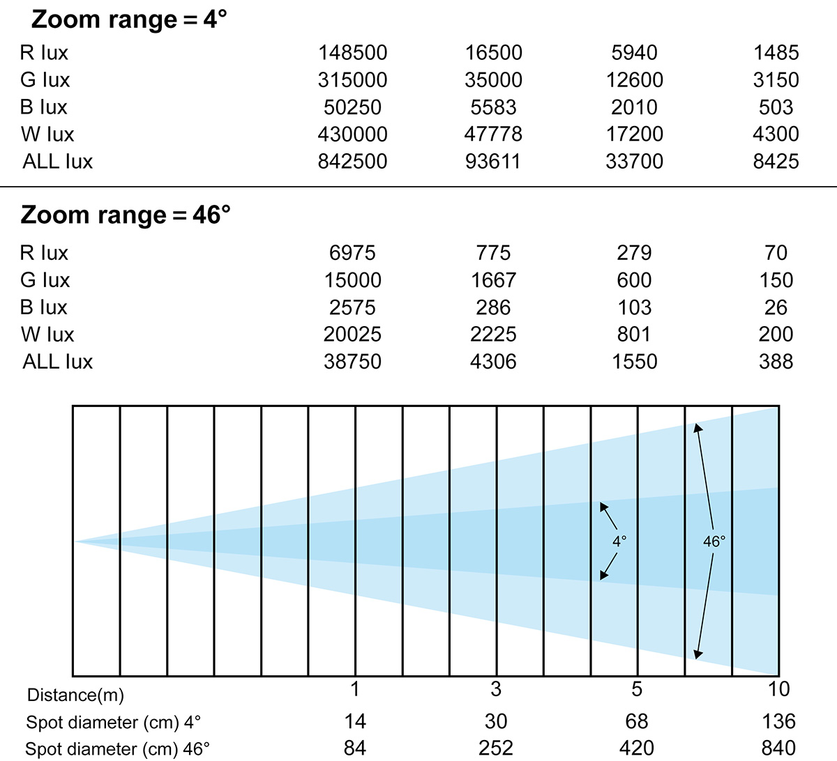 Features: Full light range dimming, 65536-level dimming accuracy. fast strobe 1- 25Hz. Single control of the LED. three-in-one effects of wash, beam, and bee eye. preset multiple color macro and effect functions