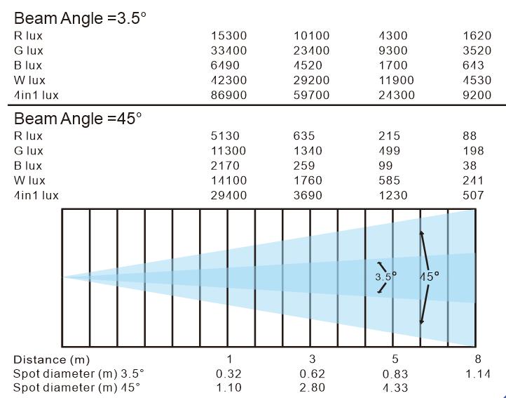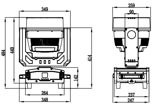 Features: Full light range dimming, 65536-level dimming accuracy. fast strobe 1-25 Hz. Single control of the LED. three-in-one effects of wash, beam, and bee eye. preset multiple color macro and effect functions
