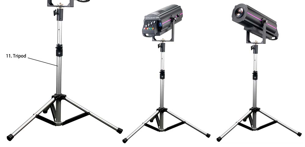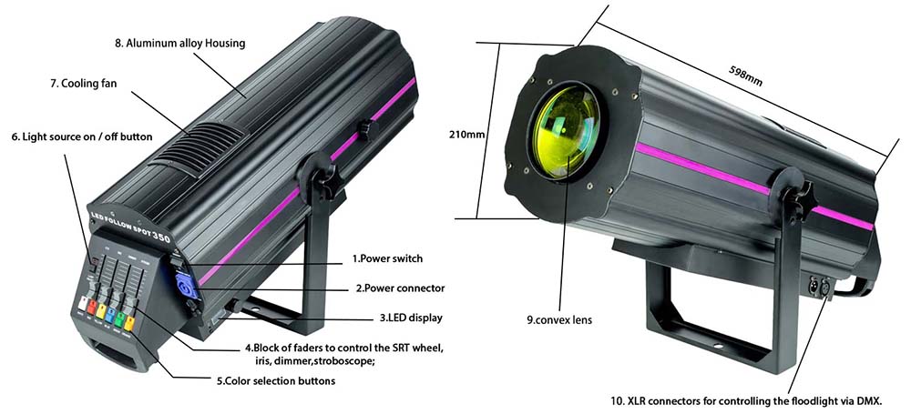 The follow spotlight is a high-power spotlight that follows performers on stage. Follow spotlights widely used in theaters, weddings, opening/closing ceremonies.