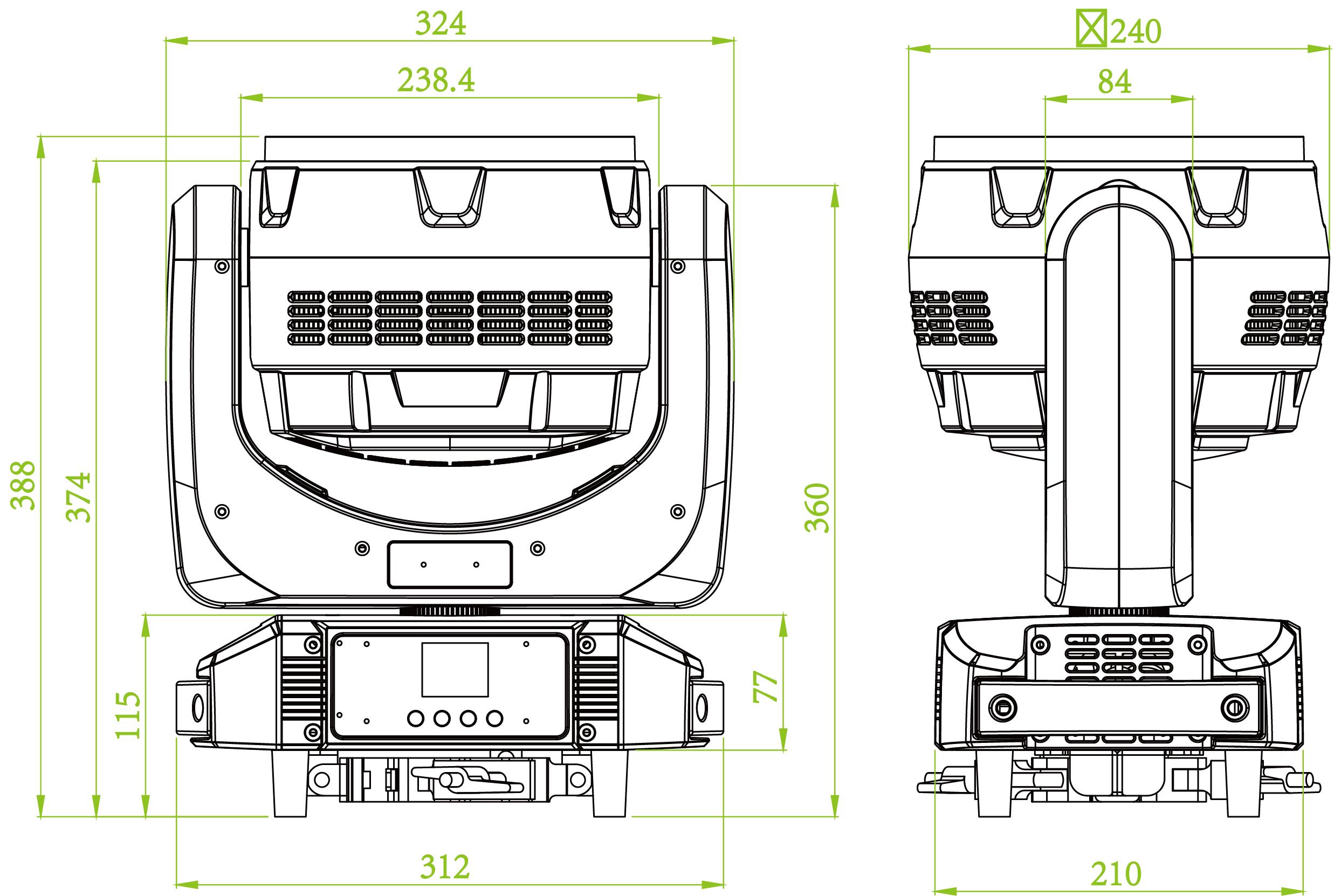 Features: Full light range dimming, 65536-level dimming accuracy. fast strobe 1- 25Hz. Single control of the LED. three-in-one effects of wash, beam, and bee eye. preset multiple color macro and effect functions