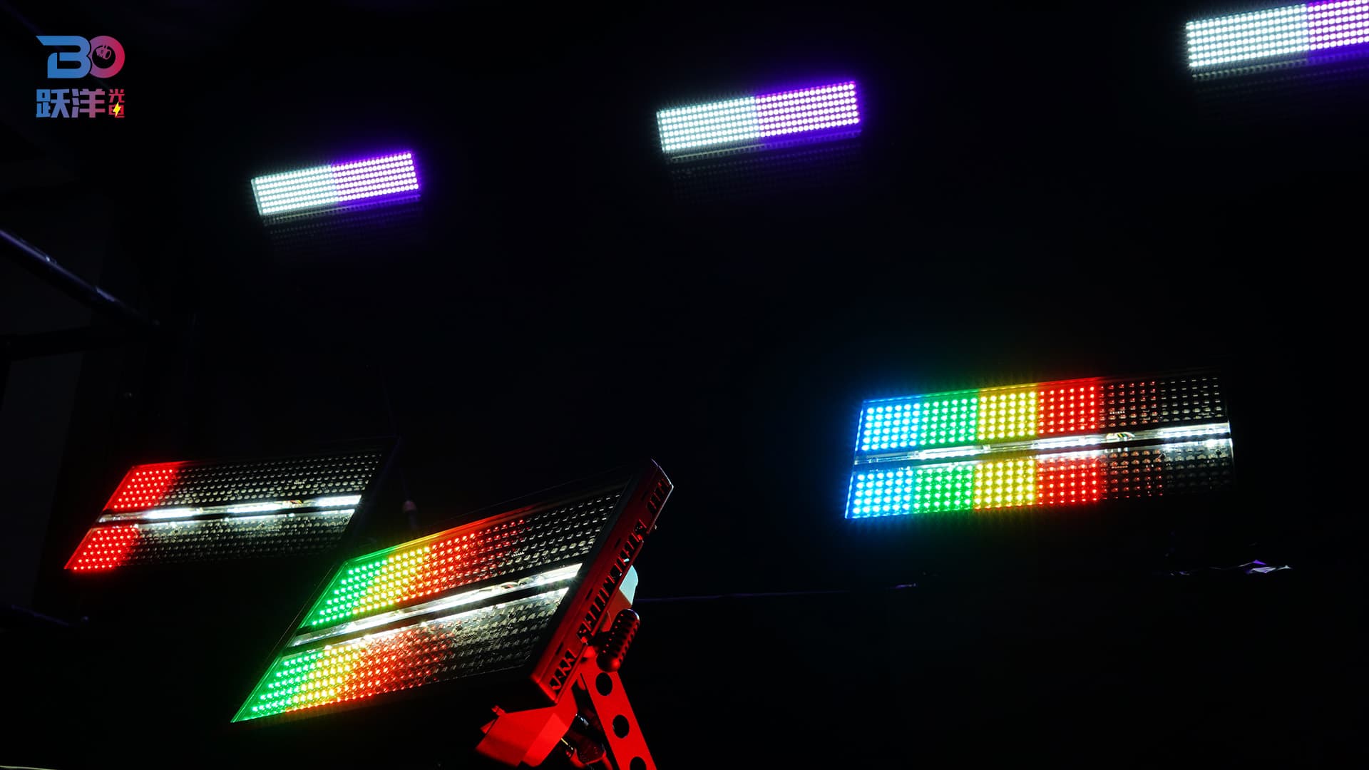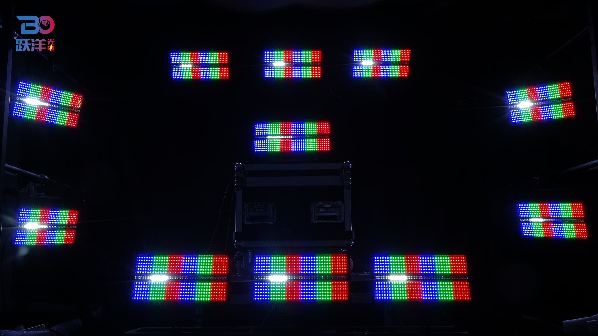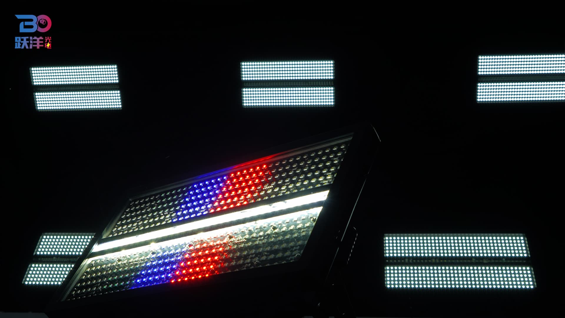Features: Full-spectrum dimming with 16-bit precision; rapid strobe from 1 to 25Hz; Both sides of 432 x 1W LEDs divided into 12 segments, middle of 36 LEDs divided into 6 segments; multiple preset color macro functions; multiple preset effect macro functions (color wash, segment control, strobe).